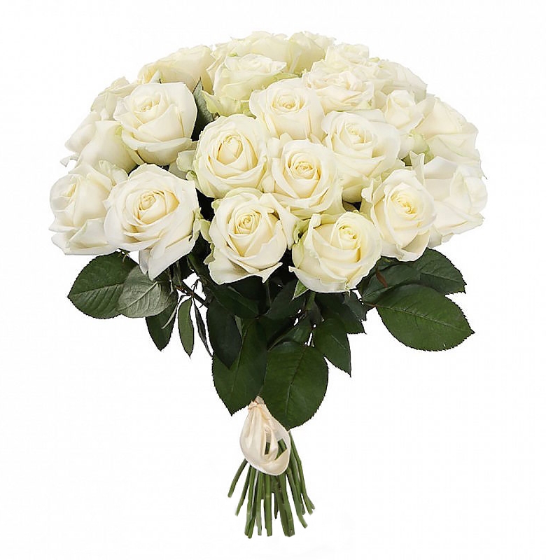 Букет состоит из 31 белая роза, прозрачная упаковка, атласная лента.