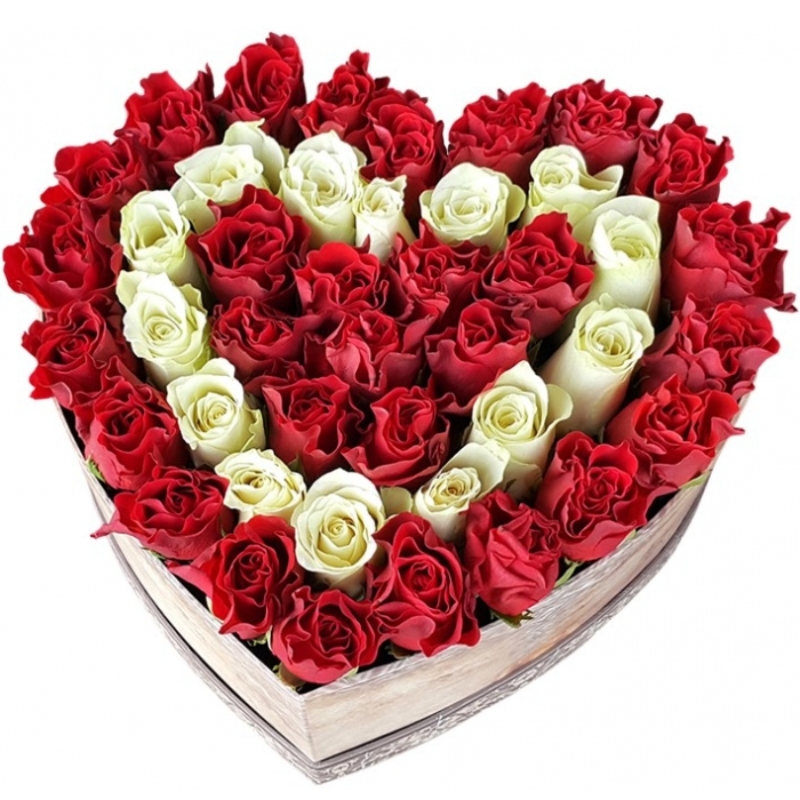 45 красных и белых роз, коробка в виде сердца.