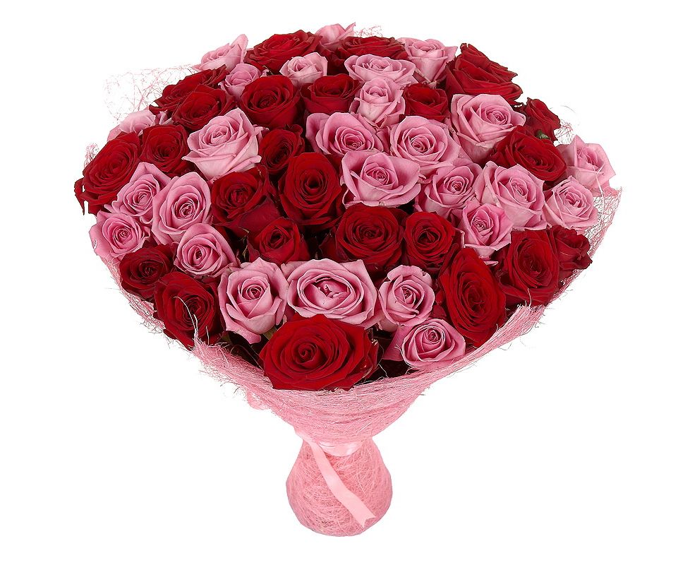 Букет состоит из 23 красной розы, 22 розовой розы, розовая упаковка, розовая или красная лента.
